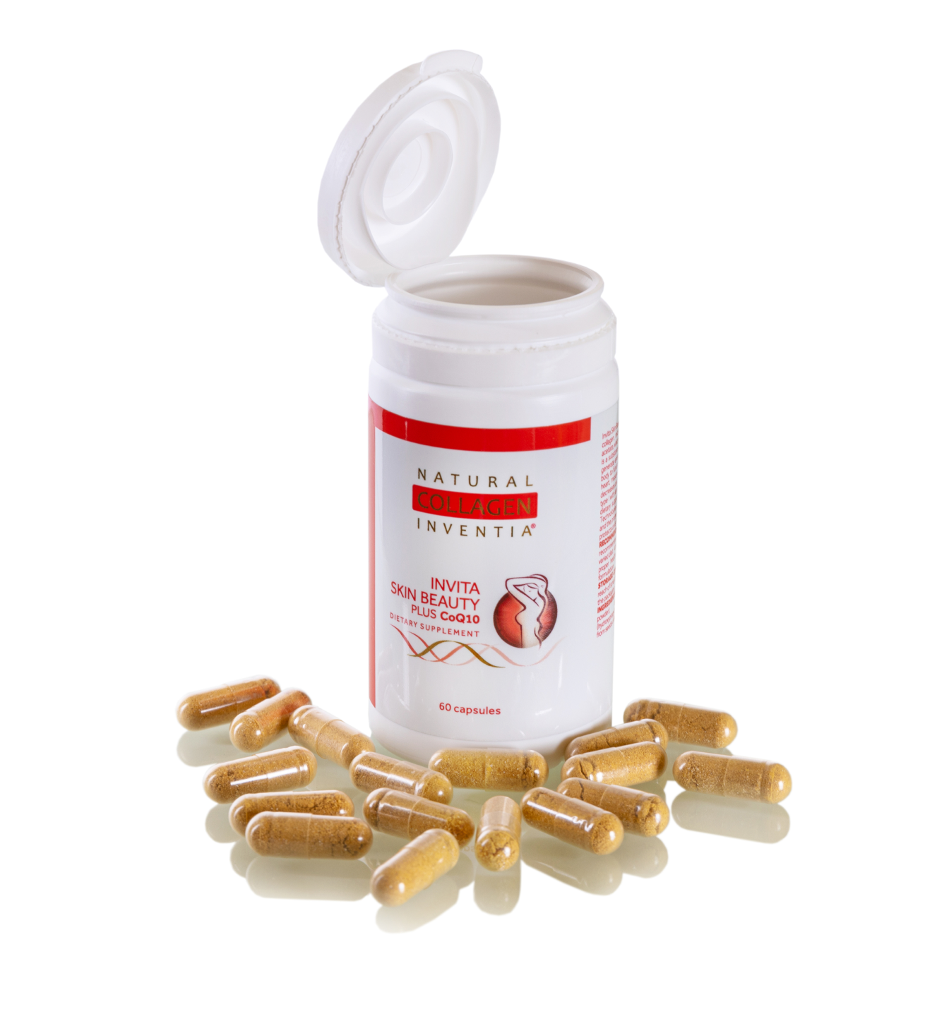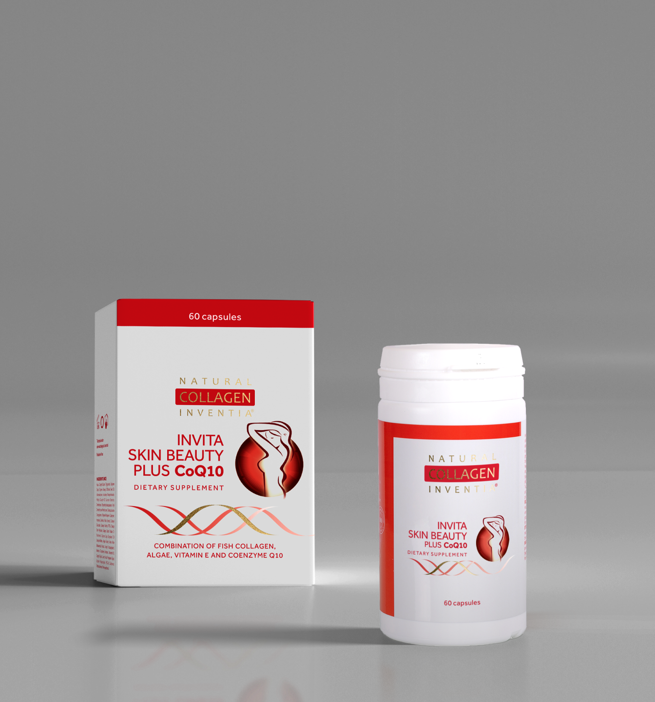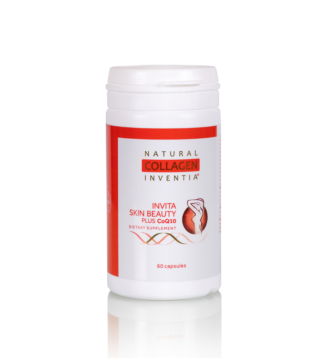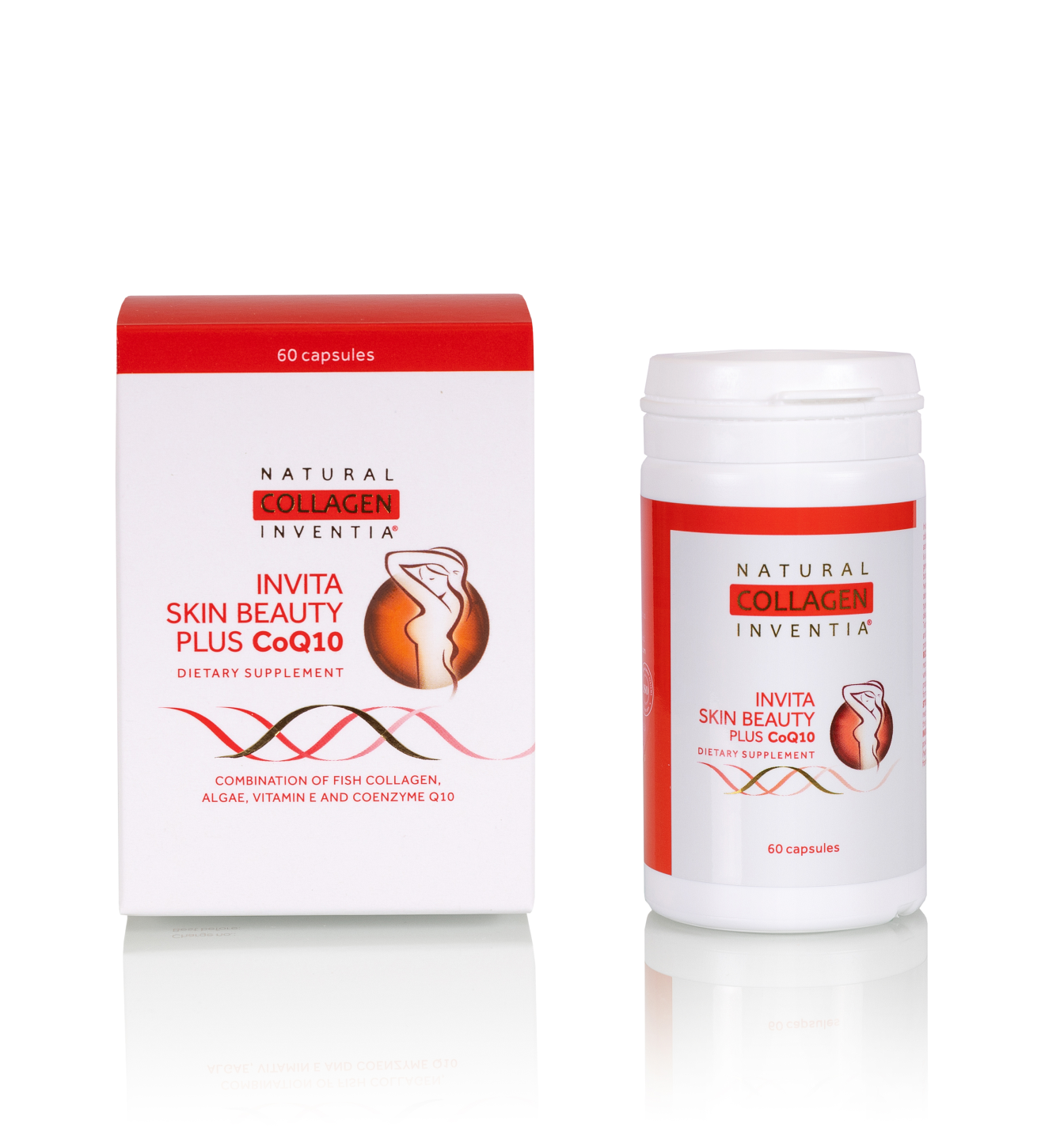 Invita Skin Beauty PLUS CoQ10 jest suplementem diety, którego pierwotny skład, zawierający liofilizat natywnego kolagenu rybiego, mikronizowane algi oraz naturalną witaminę E, w postaci octanu D-alfa-tokoferylu, został wzbogacony o cenny koenzym Q10. Koenzym Q10 to substancja o charakterze witaminy występująca naturalnie w organizmie człowieka, która bierze udział w procesie wytwarzania energii w każdej żywej komórce. Związek ten jest ważny dla funkcjonowania całego organizmu w tym szczególnie dla narządów, które cechuje największa intensywność przemiany materii tj. serce, mięśnie, wątroba i nerki. Z wiekiem poziom koenzymu Q10 w organizmie zmniejsza się, dlatego ważne staje się jego uzupełnianie. Zawarty w suplemencie diety liofilizowany, natywny kolagen rybi typu I z cytryną otrzymuje się według autorskiej metody firmy Inventia Polish Technologies Sp. z o.o. Algi zawierają jod, który pomaga zachować prawidłowe funkcjonowanie tarczycy i układu nerwowego oraz zdrową skórę, natomiast witamina E wspiera ochronę komórek przed stresem oksydacyjnym.